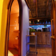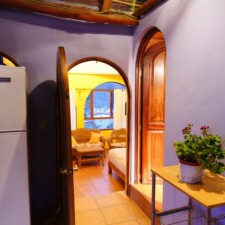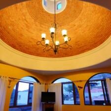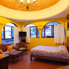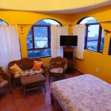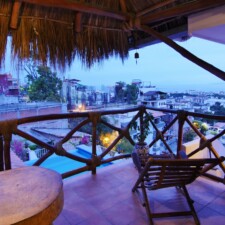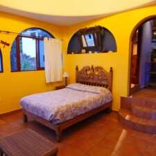 The Cupola Penthouse is located above the rooftop terrace and swimming pool. It features one very large bedroom with a cupola ceiling, and arched windows on three sides offer panoramic views of the mountains, neighborhood, and Banderas Bay.